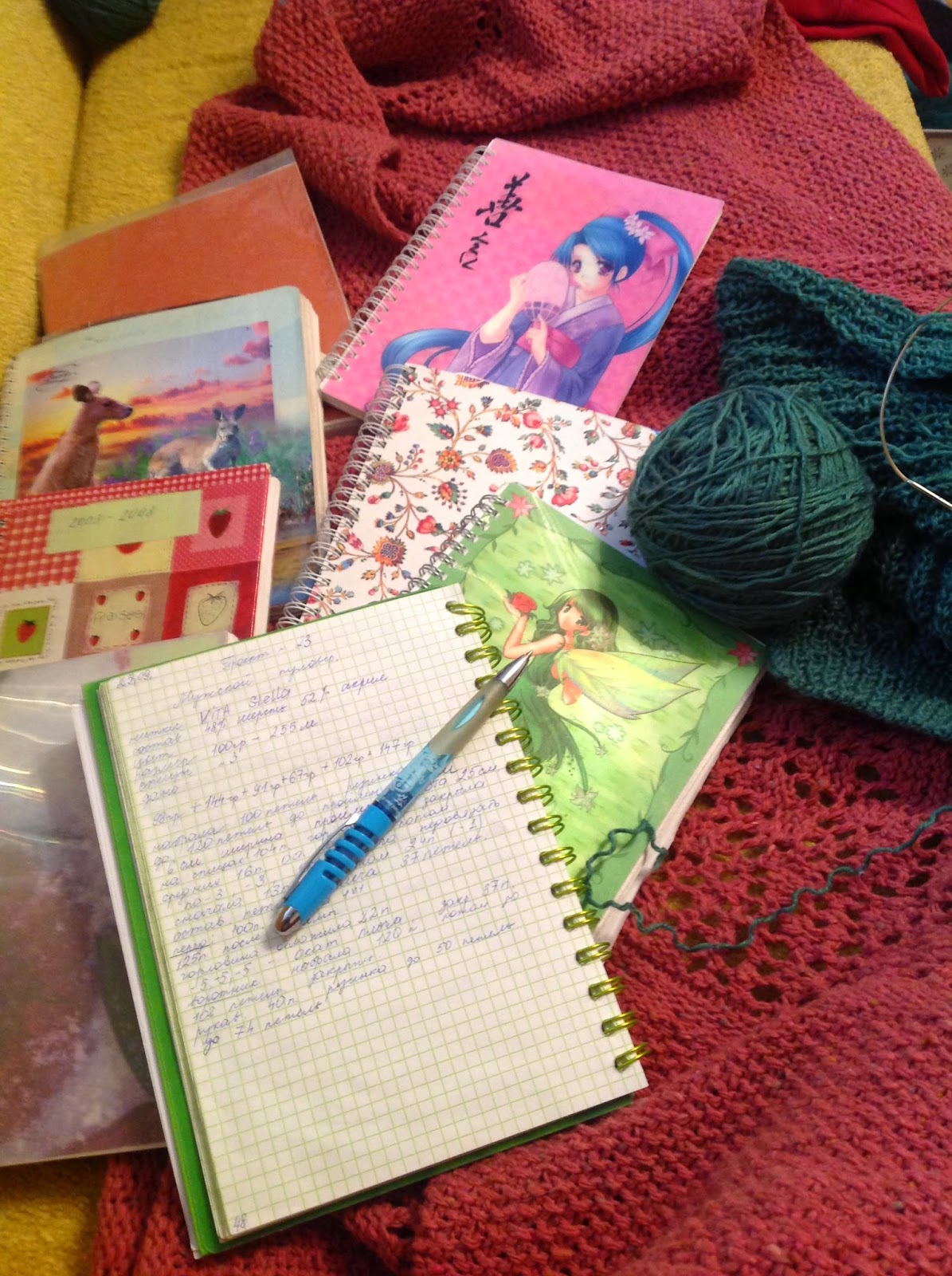 потом терадки заводились по годам...и сейчас их 7 уже...но я так и продолжаю записывать что вяжу ..где вяжу..когда вяжу..какие нитки ..сколько стоят..сколько пряжи ушло..кому эта вещь досталась...иногда просто пролистываю их....а на самом деле они мне так помогают в моем хобби..ну просто не знаю чтобы я без них делала...